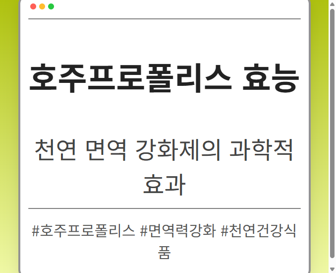 목차 호주 프로폴리스의 독특한 영양성분 생물학적 활성물질 조성 품질 기준의 차이 과학적으로 입증된 5대 효능 1. 면역 시스템 강화 2.